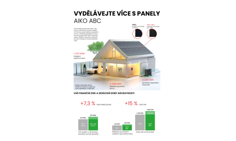 Panely AIKO jsou účinnější až o 9 %* díky nulovému stínění drátěnou mřížkou, která je na povrchu běžných panelů. Panely zachytí více sluneční energie na stejné ploše a vyrobí tak více za stejný čas. Vylepšený teplotní koeficient (Pmax) –0,26 %/1 °C (i) zajišťuje menší ztráty výroby a větší stabilitu v horkých dnech. Takže s novou technologií ABC mají panely AIKO vyšší účinnost výroby až o 4,7 %** při letních teplotách nad 25 °C. Při částečném zastínění AIKO ABC jednoznačně excelují. Využívají vlastní optimalizaci, která panelům umožňuje stále vyrábět až 90 %*** elektrické energie i v situaci, kdy běžné panely na trhu už téměř nevyrábějí. Zastíněný článek panelu ABC se také výrazně méně přehřívá než běžné panely na trhu****. Tím je zajištěn menší pokles jeho účinnosti a udržen jeho stabilní výkon. Na panely AIKO ABC je navíc poskytována extrémně dlouhá záruka 30 let při zachování alespoň 88,85 % výkonu, společně s 25letou zárukou na mechanické části panelů.